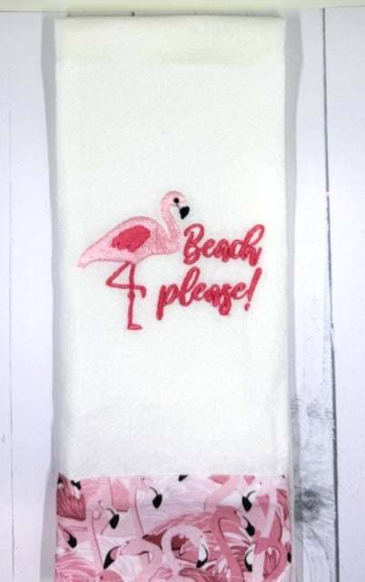 Turn up the tropical sass with our “Beach, Please!” embroidered towel—a cheeky nod to flamingo flair and seaside daydreams. This crisp white cotton towel features a fabulous pink flamingo standing tall on one leg, stitched in vibrant embroidery that pops with personality. Next to it, the phrase “Beach please!” is playfully scripted in a breezy cursive font, setting the tone for sunshine, sarcasm, and salty breezes.